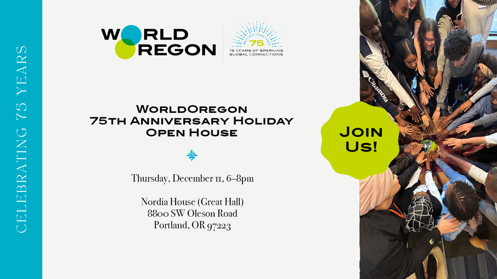 You and your guest are invited to join WorldOregon as we close out 2025 with a festive open house to say thank you to our donors, members, and volunteers and mark 75 years of sparking global connections!